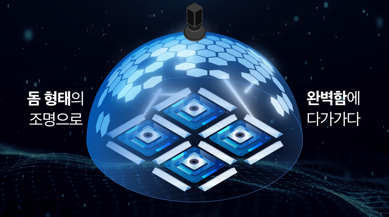 이에 따라 저희는 새로운 비전 검사 솔루션을 단계적으로 개발해 나갔습니다. 자동화 초기에는 여러 대의 카메라와 조명을 이용해 제품을 검사했지만, 이후 검사 효율과 정확도를 동시에 높이기 위해 카메라는 1대로 줄이고 거울로 이미지를 반사해 네 개의 카메라 모듈의 스무 면을 한 번에 확인할 수 있도록 설계했습니다. 여기서 더 나아가 설비 공간을 확보하고 관리 포인트를 줄이기 위해 조명을 0도, 45도, 90도로 전부 배열 가능한 돔 형태로 설계하는 방안을 고안했습니다. 이러한 반복적인 개선을 통해 검사 정확도는 높이고, 카메라 수와 설비 규모는 줄인 고효율 솔루션을 완성할 수 있었습니다. 그 결과 생산성은 약 40% 향상되고, 설비 공간은 약 75% 확보하는 성과를 거두었습니다.