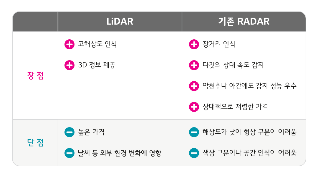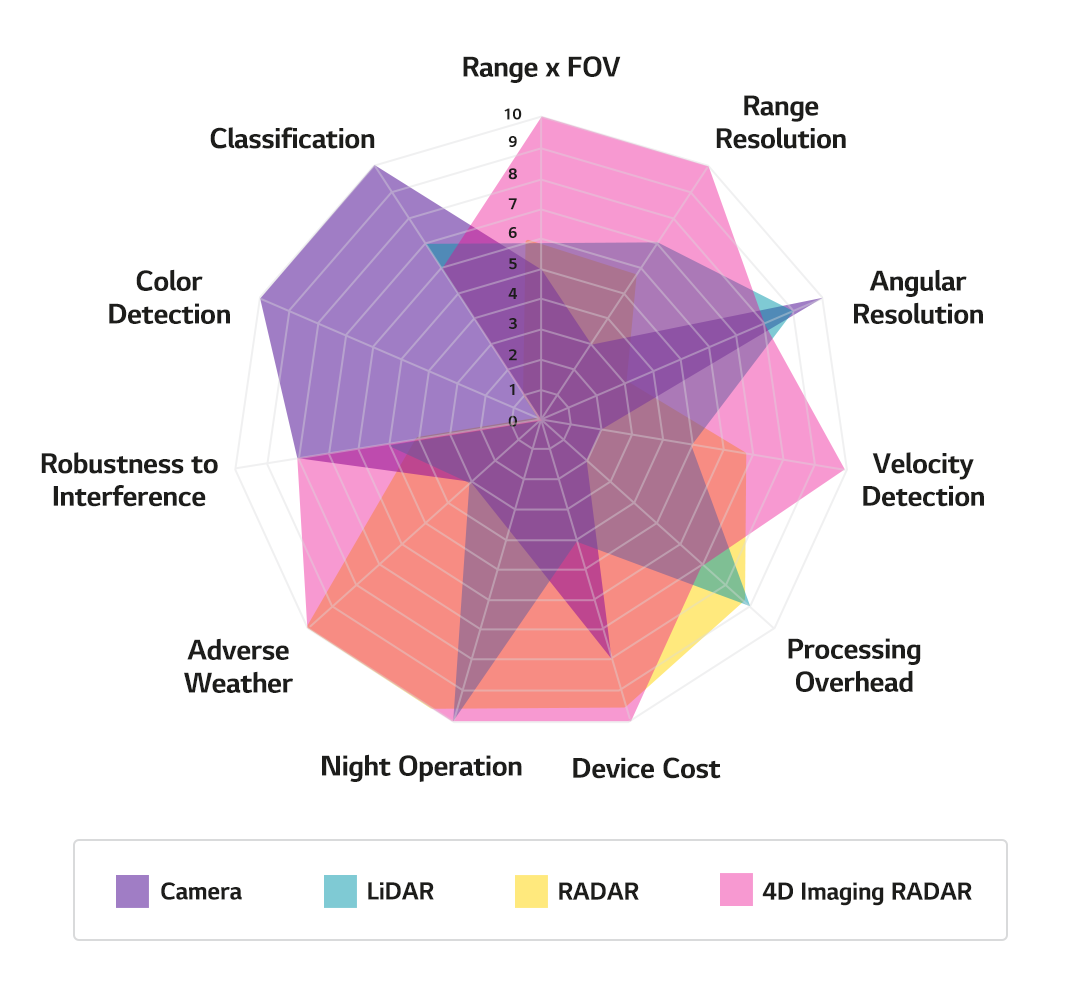 이 중에서 전파를 활용하는 RADAR의 경우, 야간, 안개, 구름이나 먼지에도 전파의 송수신에 영향을 덜 받으므로 악천후/외부 환경에 강한 장점이 있다. 또한 LiDAR보다 부피가 작고 가격 측면에서도 상대적으로 저렴하며, 소형화가 가능해 디자인 측면의 자유도도 높다.