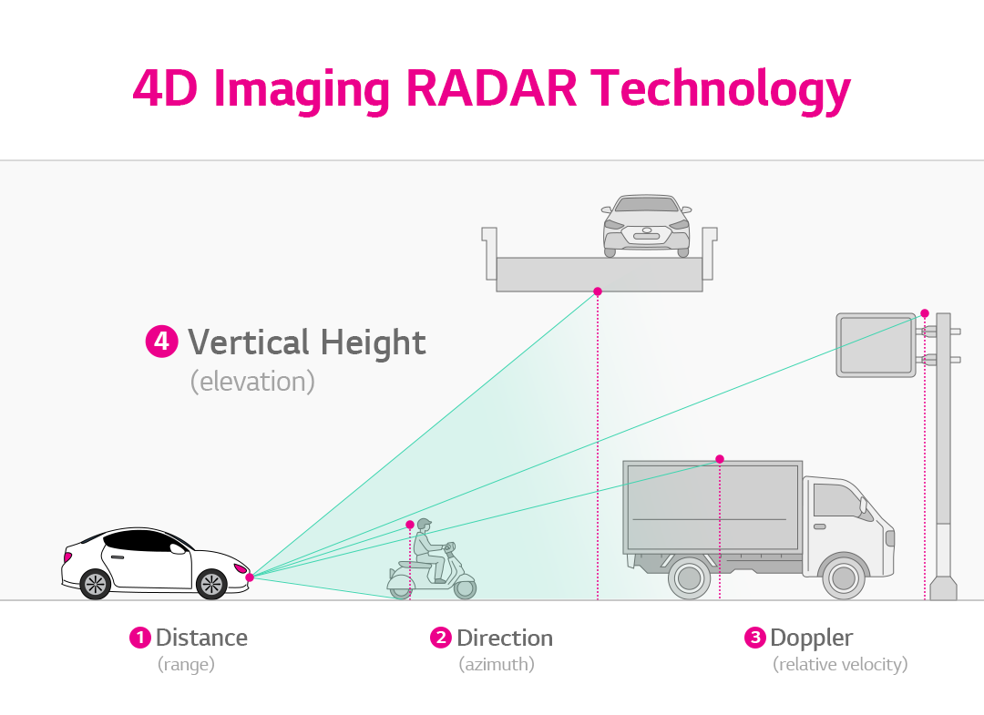 While the existing 3D RADAR can identify distance (range), direction (azimuth), and relative velocity (Doppler), 4D-imaging-RADAR technology adds another dimension of information: height (elevation, vertical angle). Therefore, 4D imaging RADAR can provide richer and more accurate data about the driving environment than before by identifying the height of an object or how high the object is located on the road.