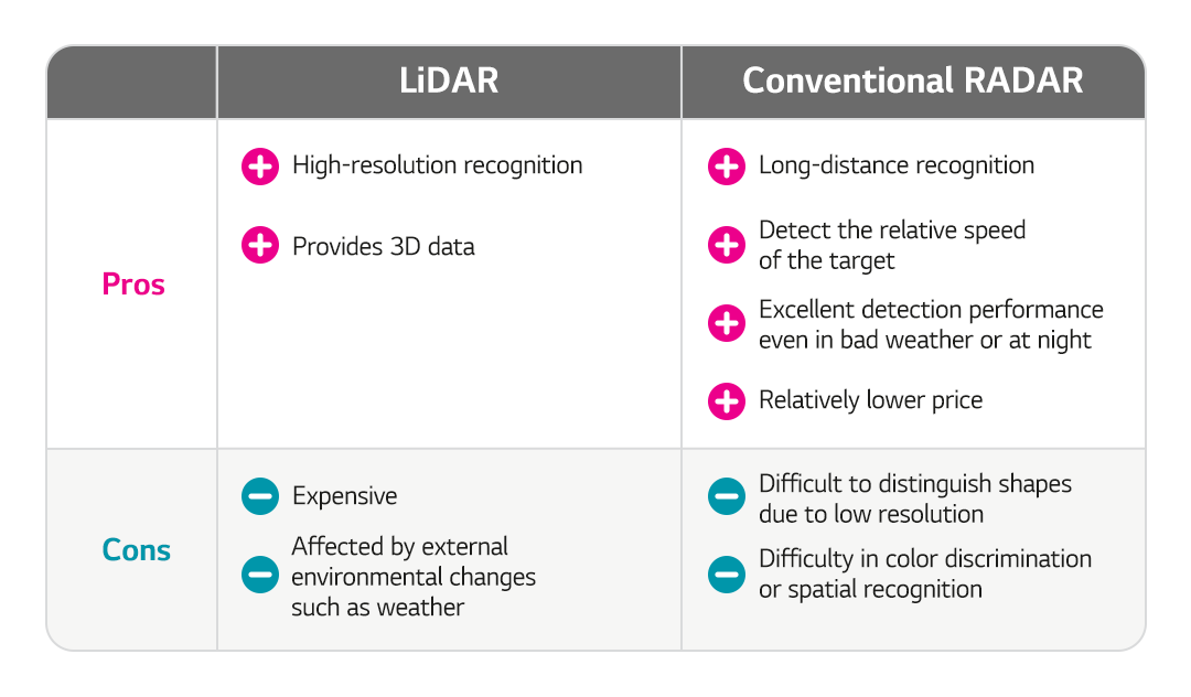 Among these solutions, RADAR, which uses radio waves, has strong advantages in bad weather/external environments because it is less affected by nighttime darkness, fog, cloud or dust when it comes to radio-wave transmission and reception. In addition, it is less bulky than LiDAR, reasonably priced, and allows for more freedom in terms of design.