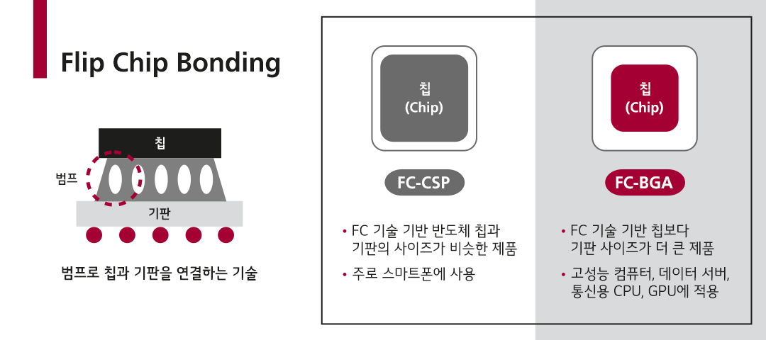 반도체 칩과 기판을 연결하는 기술은 미세 와이어를 사용해 연결하는 와이어 본딩(Wire Bonding) 방식에서 와이어를 사용하지 않고 범프를 사용하여 전기적인 연결로 속도가 빠르고 패키징의 사이즈를 줄일 수 있는 플립칩(Flip Chip) 방식으로 진화하고 있다. 플립칩 방식은 칩의 활성 영역을 아래로 뒤집어 다른 기판이나 칩에 붙이는 기술로, 땜납, 구리, 니켈, 금으로 볼 형태의 범프를 만들어 칩과 기판을 연결한다. 이러한 플립칩 기술 기반으로 제작된 기판은 크게 FC-CSP(Flip Chip-Chip Scale Package, 플립칩 칩스케일 패키지)와 FC-BGA(Flip Chip-Ball Grid Array, 플립칩 볼그리드 어레이)로 나뉘는데, FC-CSP가 주로 스마트폰에 사용되고 있다면, FC-BGA는 고성능 컴퓨터, 데이터 서버, 통신용 CPU/GPU에 적용되고 있다.