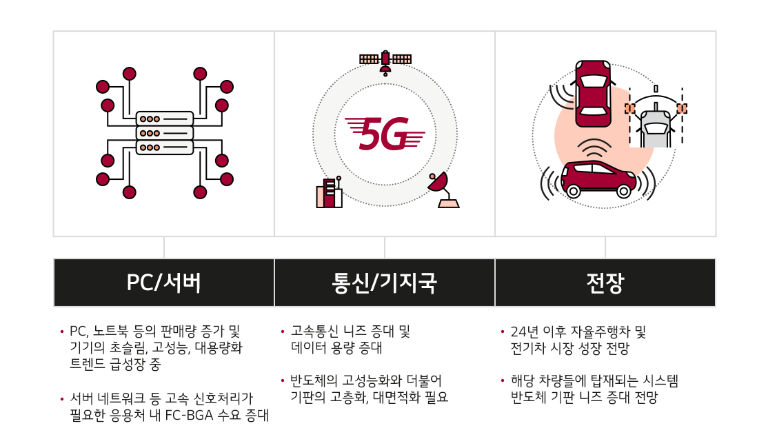 앞으로도 언택트 문화 지속에 따른 IT제품 수요, 자율주행 트렌드, 데이터센터 구축 등으로 반도체가 접목되는 현재와 미래 필수 기술은 늘어날 것이며, FC-BGA가 적용되는 PC/서버, 통신/기지국 산업 및 전장 산업 내의 수요도 지속 증대될 것으로 예상된다. LG이노텍은 다양한 기판 제품에 대한 오랜 사업 경험을 기반으로 축적된 안정적 양산 및 보급 능력과 가공 기술, 여기에 디지털 혁신을 더해 고객 경험의 혁신을 지속할 예정이다.