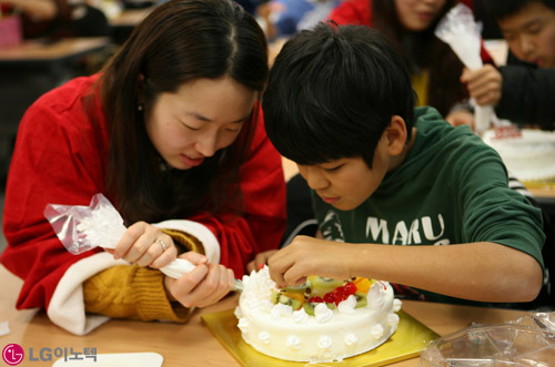 사진2. LG이노텍 직원이 ‘산타가 간다’ 프로그램을 진행하며 어린이와 함께 케이크를 만들고 있다.