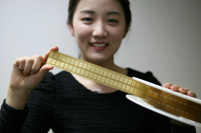LG이노텍 임직원이 릴투릴 형식으로 생산된 스마트카드용 테이프 타입 기판을 펼쳐보고 있다.
