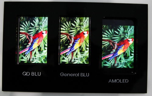 사진1) LG이노텍 퀀텀닷 BLU를 General BLU, AMOLED와 비교해 보여주고 있다.
