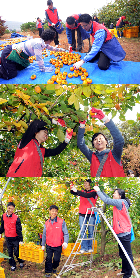 [사진설명] LG이노텍 행복나눔팀 봉사단원들이 농촌사랑 행복나눔 사회공헌활동의 일환으로 지난 8일 전남 담양군 고서면 일대 농가를 찾아 단감 수확 일손을 돕고 있다.
