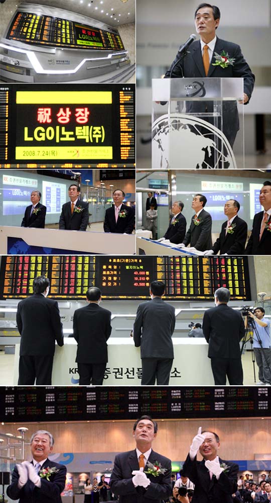 이날 LG이노텍 허영호 사장은 “이번 상장으로 IT업종의 글로벌 부품기업으로 성장할 수 있는 계기를 맞이하게 되었다”며 “LG이노텍을 믿고 투자해 주신 분들께 보답하기 위해 투자자와 주주에 대한 의무를 성실히 수행할 것을 약속 드린다”고 밝혔다.