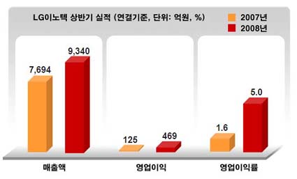 LG이노텍(대표 허영호)이 08년 상반기에 연결기준으로 안정적인 매출액과 영업이익을 기록했다. 매출 9,340억원, 영업이익 469억원, 영업이익률 5%를 달성했다. 이는 전년 동기대비 매출 21%, 영업이익은 275% 증가한 수치이다. (참고 : 2007년 상반기 매출 7,694억원, 영업이익 125억원, 영업이익률 1.6%)