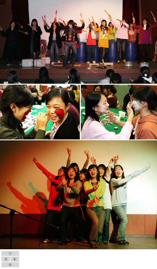 ① LG이노텍 여성인턴사원들이 지난 15일부터 이틀간 경기도 양평 미리내 캠프장에서 열린 ‘1-Step 여성 인턴십 아웃도어 프로그램’에서 난타 공연을 선보이고 있다. 팀원들과의 단합이 돋보인 무대.