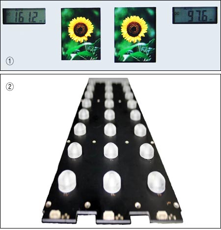 ① LG이노텍이 개발한 저소비전력 LCD모듈(右)과 기존 LCD모듈(左)