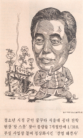 “2001년 3월 전남 광주의 LG이노텍 부품사업본부장에 취임했더니 주요 생산 품목인 튜너의 불량률이 2.6%나 되더군요. 연말까지 불량률을 10분의 1 이하로 줄이라고 했습니다. 공장 근로자들은 물론 간부들까지 20년이 지난 구식 설비로는 도저히 불가능하다고 반발하더군요. 그렇지만 7개월 만에 목표를 관철시켰습니다. 문제 해결의 포인트를 제시하면서 직원들을 독려한 것이 주효했던 거지요. 최근 블루오션 전략으로 유명세를 타고 있는 김위찬 교수의 표현을 빌리자면 ‘핫 스폿(Hot Spot)’, 즉 문제의 급소를 찾아내는 일이 급선무였습니다. 현장에 살다시피 하면서 뭐가 문제인지를 고민했습니다. 기판위에 회로를 장착시키는 칩 마운트 흡착과정이 ‘핫 스폿’이라는 사실을 발견할 수 있었지요.”