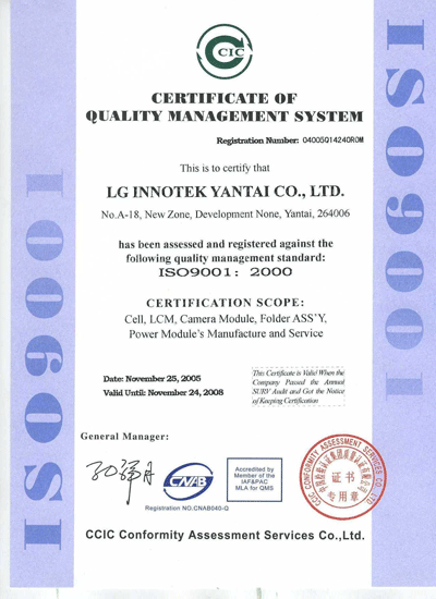 LG이노텍 연태법인이 지난 11월 8일에서 10일까지 3일간의 CCIC 인증기관의 감사를 거쳐 11월 25일, ISO9001:2000 인증서를 획득했다. LG이노텍 연태법인은 짧은 기간임에도 불구하고 품질시스템을 각 부문의 Process에 적절하게 수립, 품질방침에 준하여 품질목표가 수립되었고, 이에 따라 전 법인 사우들이 품질목표 달성을 위한 노력을 아끼지 않았다.