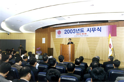 특히 올해가 지난 해 이기는 경영의 원년에 이어, 이기는 경영의 제2라운드 라 말하면서 질과 양, 모든 면에서 성장의 가속도를 비약적으로 높여 나가야 하는 새로운 도약의 전환점이라 강조하고 <1등 사업 육성 및 성장기반 확보> <내실 경영 강화><1등 LG 달성을 위한 조직역량 강화>의 `03년도 경영방침을 달성하기 위해 최선을 다해 나가자고 역설했다.