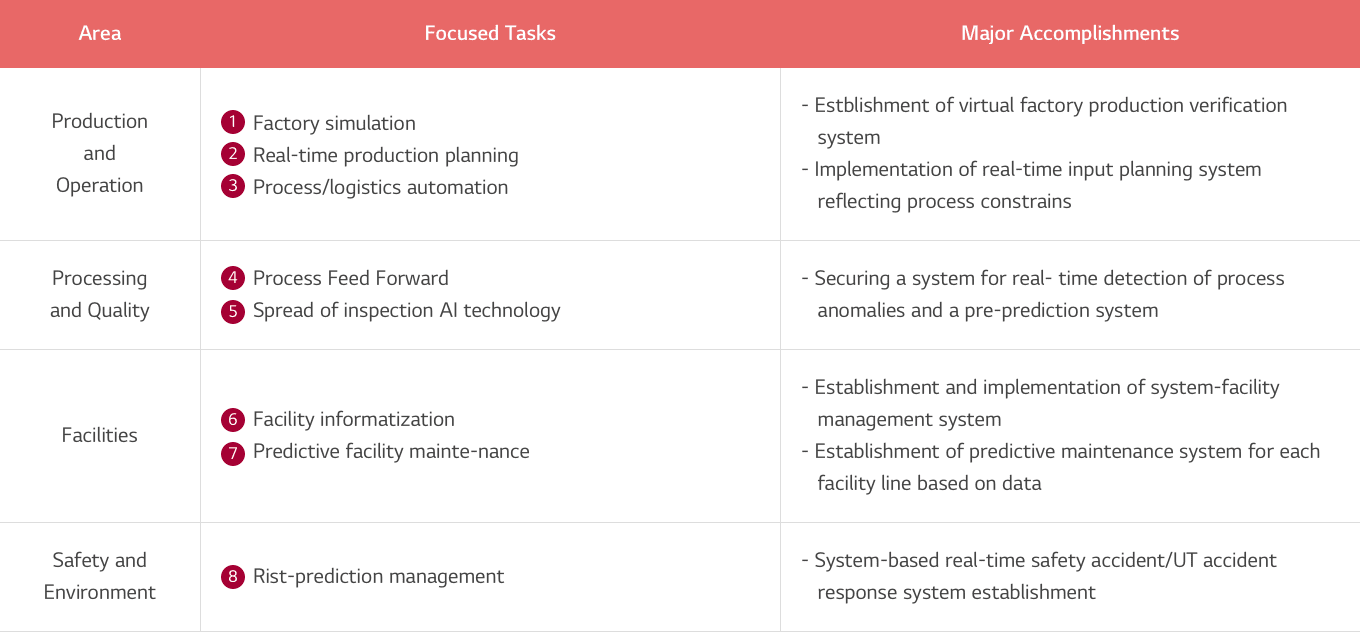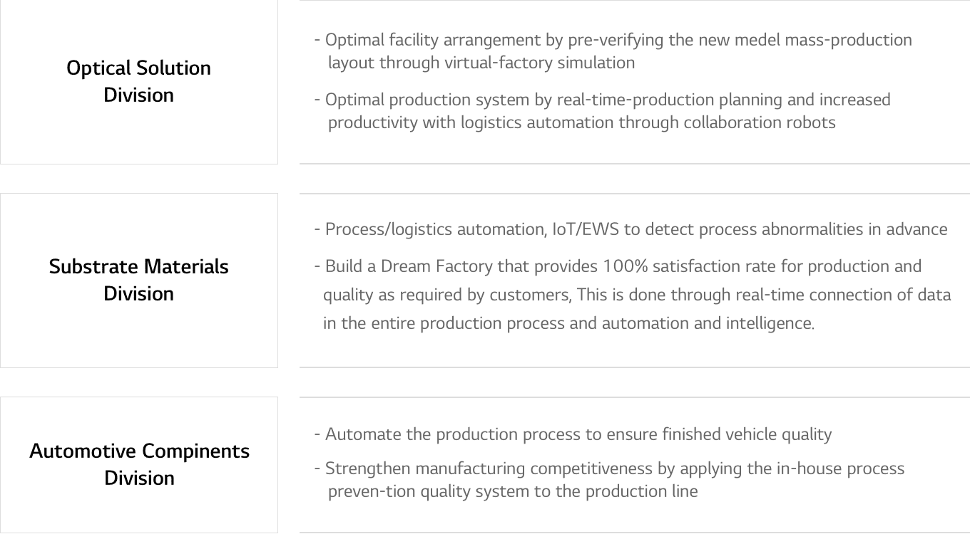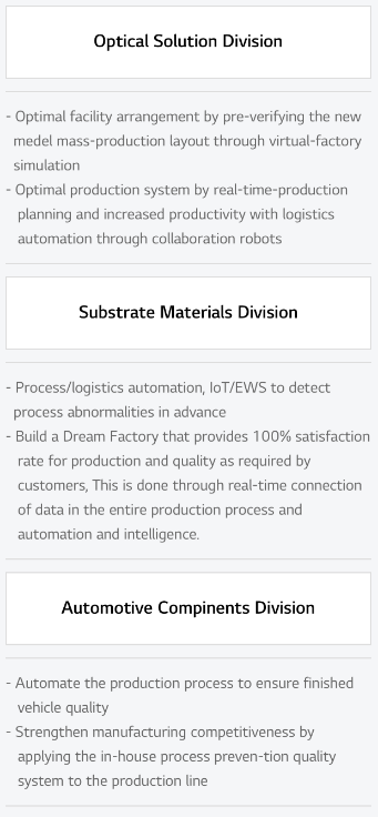 With the goal of 90% per day, LG Innotek intends to realize a digital twin through data-based virtual design, virtual verification, and virtual process and measurement experiment data connection. The goal is to perform design verification and failure prediction simulation of major processes with 90% accuracy within one day. LG Innotek aims to significantly shorten the lead time of product development for customers by predicting and responding to defects that may occur in the customer's process as well as the entire process from development and mass production of its products, which will lead to a stronger customer market competitiveness.