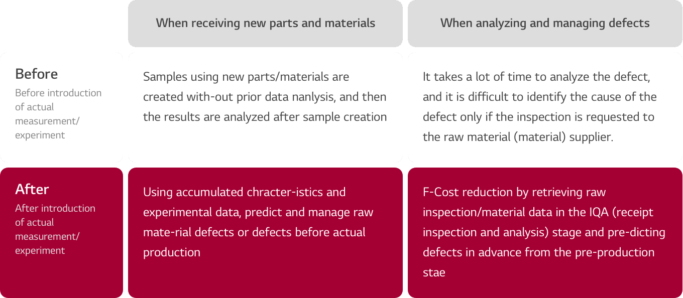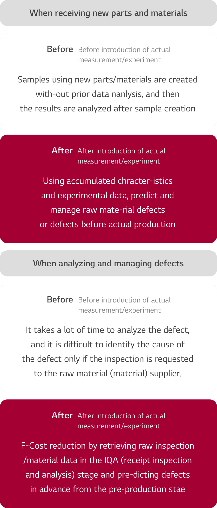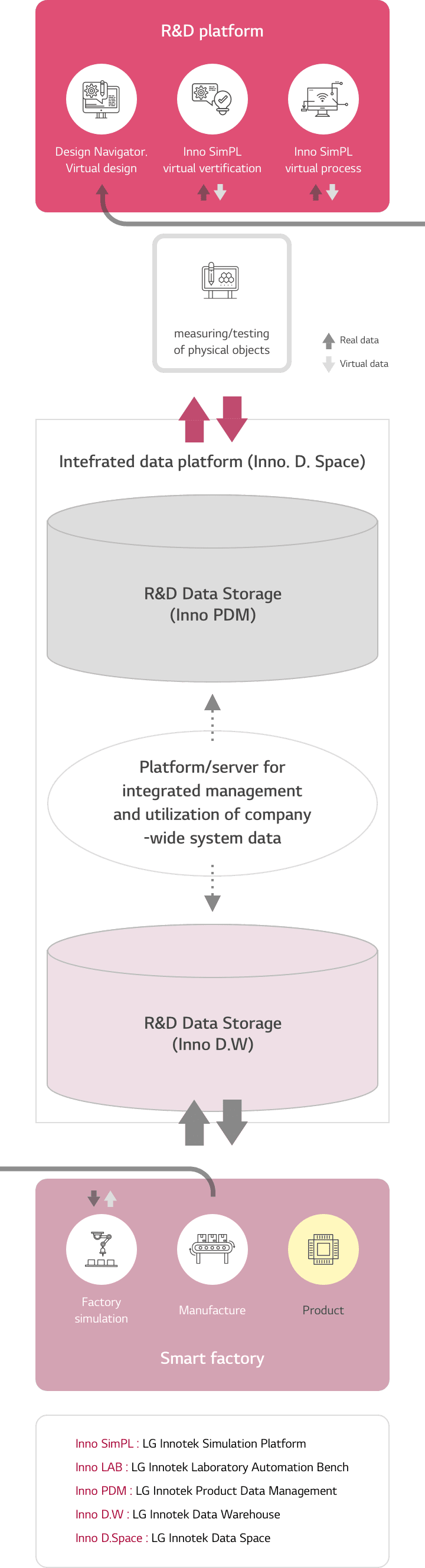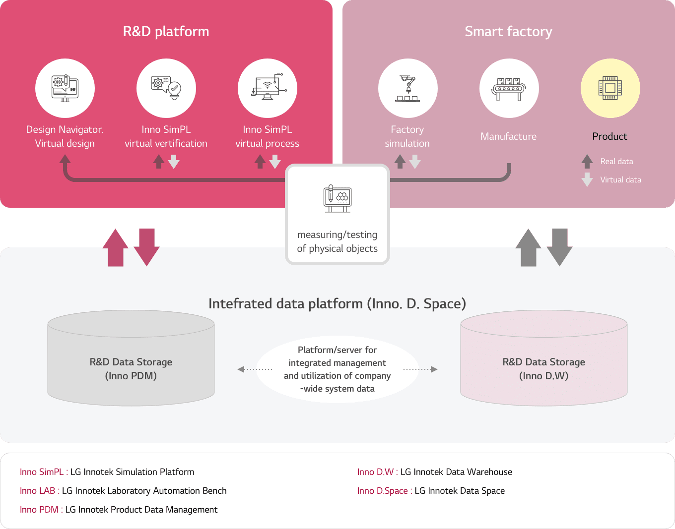 LG Innotek utilizes measurement/experimental data of various real-world products (samples, final products, etc.) in all stages from product design to production at the time of designing/production of other products in the future. This is to identify defects in raw materials or process issues in advance to build a specialized platform (Inno LAB). All data(conditions and results of raw materials, temperature, angle, etc.) produced from various real-world objects are automatically collected, stored, and connected back to the virtual development stage, thereby improving prediction accuracy and performance.